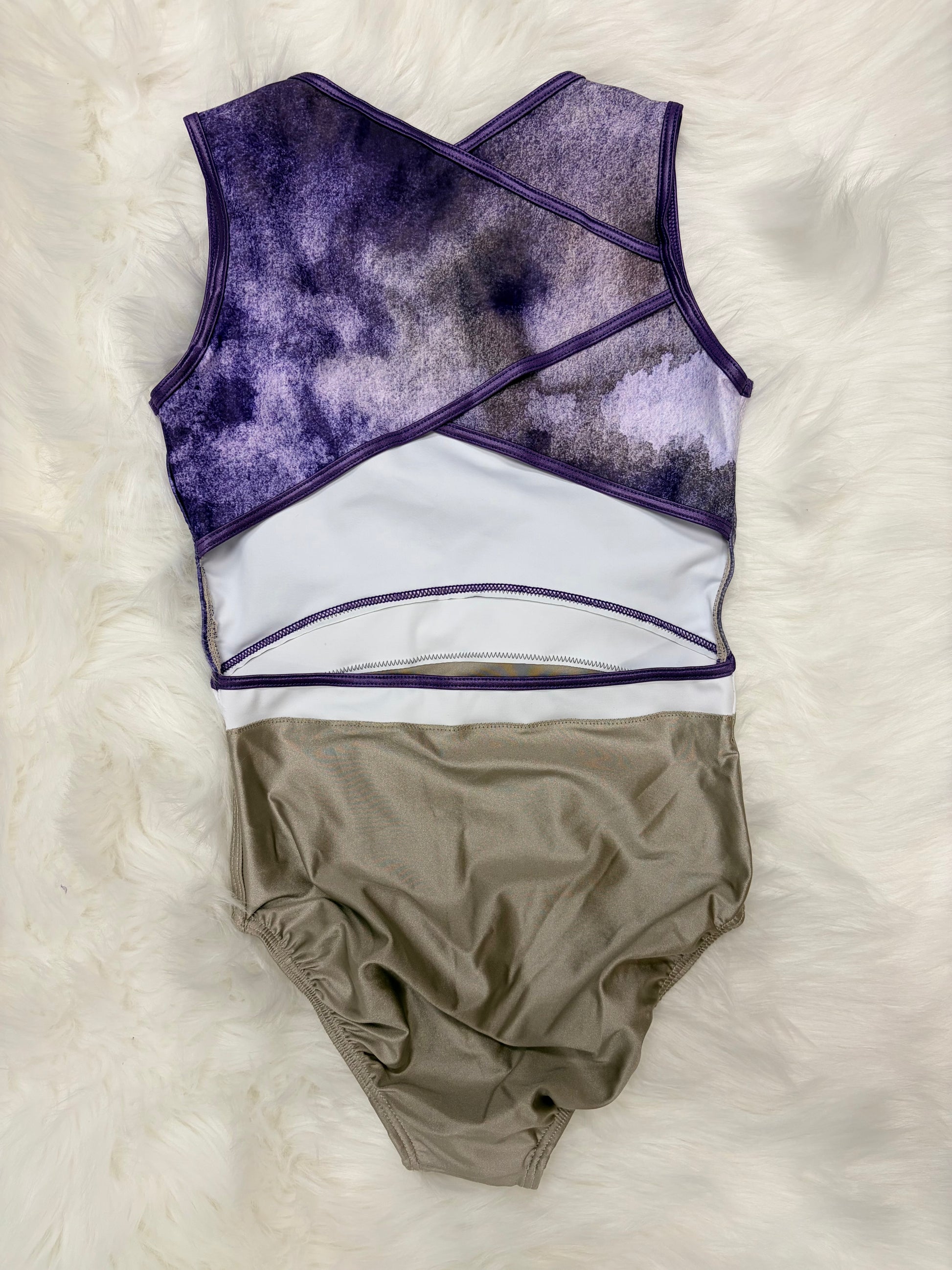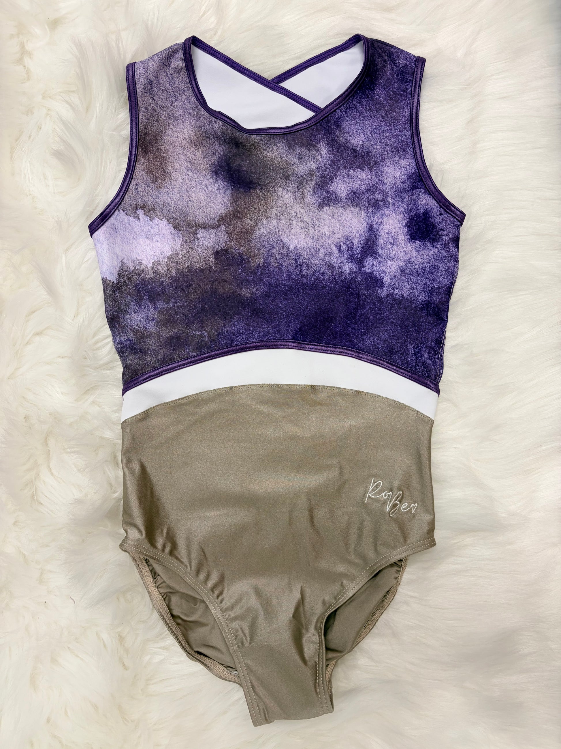 The Dusky Haze leotard brings an effortless cool-girl vibe with its dreamy blend of beige, purple, and grey tones. Cinched with a striking purple belt that defines your silhouette, this piece sits beautifully with a taupe bottom for a sophisticated look. Perfect for those who love color harmony without the drama—think moody, modern, and totally wearable.