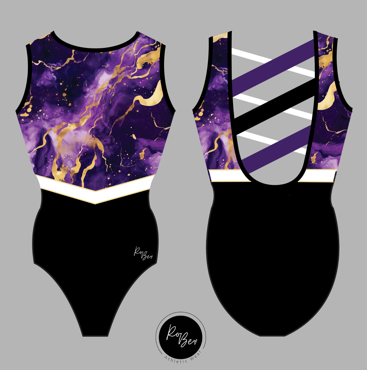 Elevate your performance with the Power Play leotard, designed for athletes who demand style and function. The striking purple and gold geode-patterned top contrasts beautifully with the sleek black lycra bottom, creating a bold statement piece. The strappy back design offers both support and breathability, while the crisp white belt cinches your silhouette for a polished, confident look.